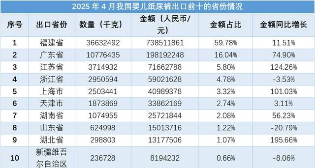 從出口省份來(lái)看,2025年4月我國(guó)嬰兒紙尿褲出口金額前5的省份分別為福建省、廣東省、江蘇省、浙江省和上海市。
